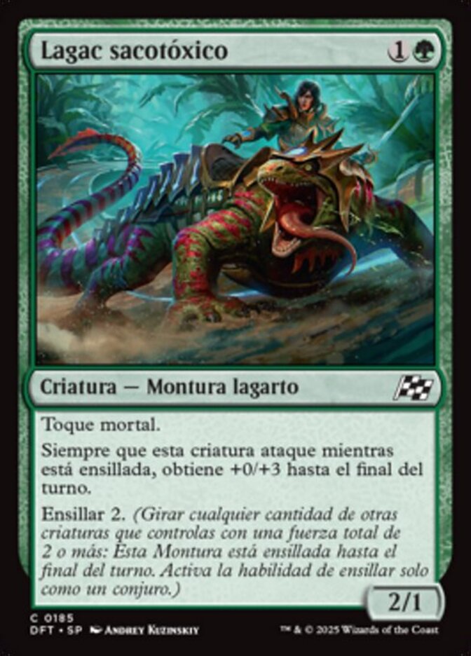 | Rules | Deathtouch Whenever this creature attacks while saddled, it gets +0/+3 until end of turn. Saddle 2 (Tap any number of other creatures you control with total power 2 or more: This Mount becomes saddled until end of turn. Saddle only as a sorcery.) |