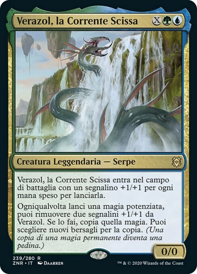 | Rules | Verazol, the Split Current enters the battlefield with a +1/+1 counter on it for each mana spent to cast it. Whenever you cast a kicked spell, you may remove two +1/+1 counters from Verazol. If you do, copy that spell. You may choose new targets for the copy. (A copy of a permanent spell becomes a token.) |