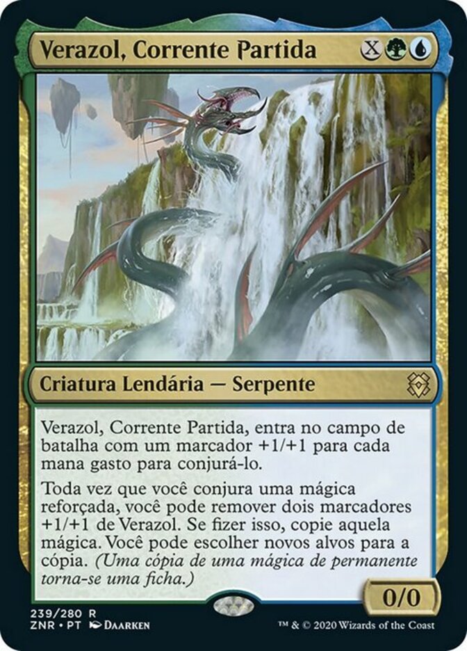 | Rules | Verazol, the Split Current enters the battlefield with a +1/+1 counter on it for each mana spent to cast it. Whenever you cast a kicked spell, you may remove two +1/+1 counters from Verazol. If you do, copy that spell. You may choose new targets for the copy. (A copy of a permanent spell becomes a token.) |