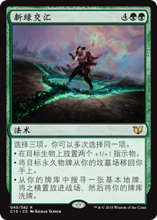 | Rules | Choose three. You may choose the same mode more than once. • Put two +1/+1 counters on target creature. • Return target permanent card from your graveyard to your hand. • Search your library for a basic land card, put it onto the battlefield tapped, then shuffle. |