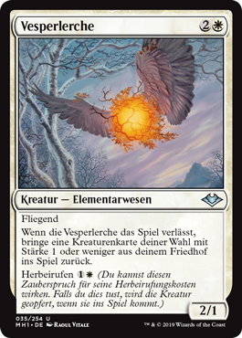 | Rules | Flying When Vesperlark leaves the battlefield, return target creature card with power 1 or less from your graveyard to the battlefield. Evoke (You may cast this spell for its evoke cost. If you do, it's sacrificed when it enters the battlefield.) |