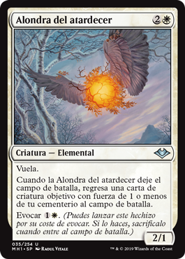 | Rules | Flying When Vesperlark leaves the battlefield, return target creature card with power 1 or less from your graveyard to the battlefield. Evoke (You may cast this spell for its evoke cost. If you do, it's sacrificed when it enters the battlefield.) |