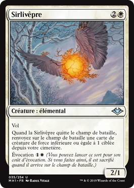 | Rules | Flying When Vesperlark leaves the battlefield, return target creature card with power 1 or less from your graveyard to the battlefield. Evoke (You may cast this spell for its evoke cost. If you do, it's sacrificed when it enters the battlefield.) |