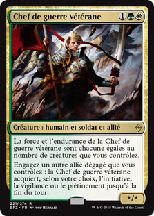 | Rules | Veteran Warleader's power and toughness are each equal to the number of creatures you control. Tap another untapped Ally you control: Veteran Warleader gains your choice of first strike, vigilance, or trample until end of turn. |