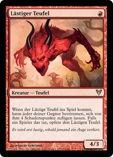 | Rules | When Vexing Devil enters the battlefield, any opponent may have it deal 4 damage to them. If a player does, sacrifice Vexing Devil. |