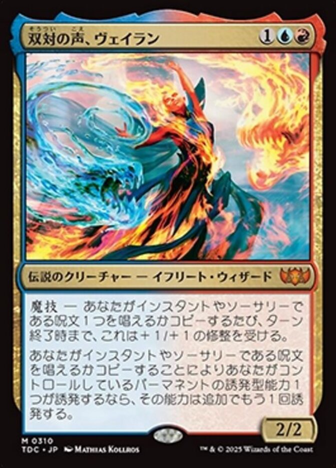 | Rules | Magecraft — Whenever you cast or copy an instant or sorcery spell, Veyran, Voice of Duality gets +1/+1 until end of turn. If you casting or copying an instant or sorcery spell causes a triggered ability of a permanent you control to trigger, that ability triggers an additional time. |