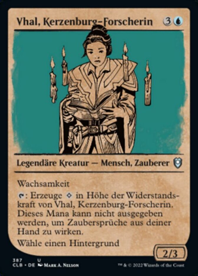 | Rules | Vigilance : Add a number of equal to Vhal, Candlekeep Researcher's toughness. This mana can't be spent to cast spells from your hand. Choose a Background (You can have a Background as a second commander.) |