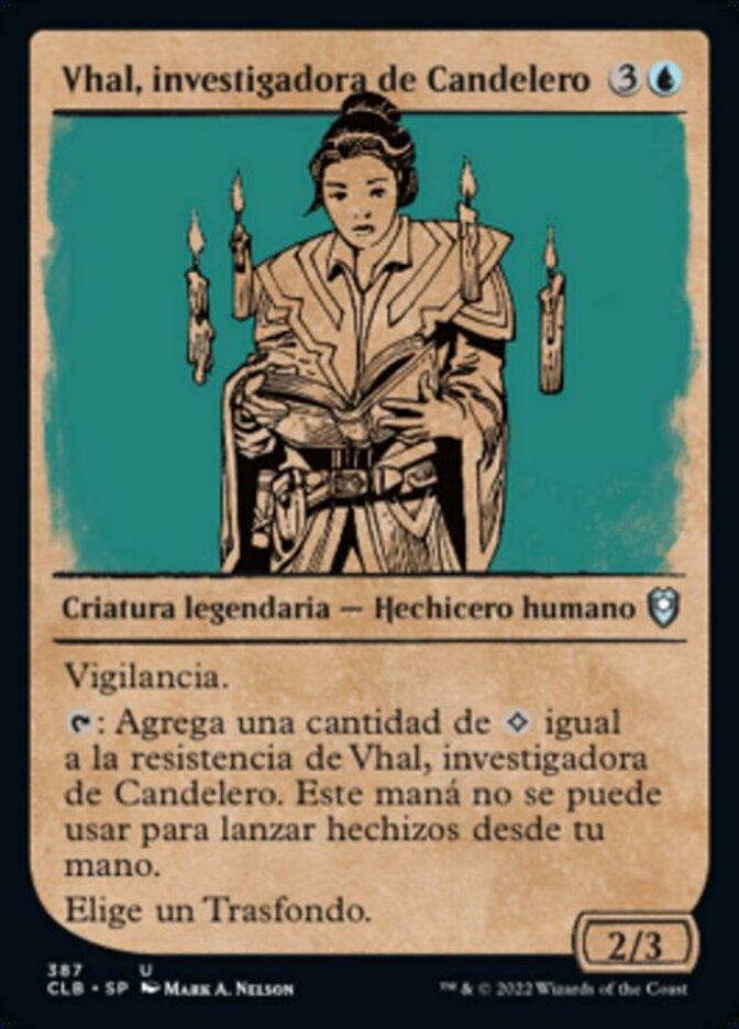 | Rules | Vigilance : Add a number of equal to Vhal, Candlekeep Researcher's toughness. This mana can't be spent to cast spells from your hand. Choose a Background (You can have a Background as a second commander.) |