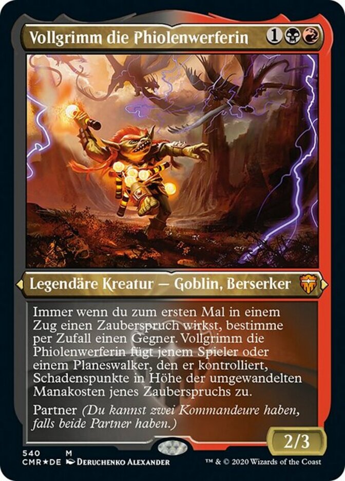 | Rules | Whenever you cast your first spell each turn, choose an opponent at random. Vial Smasher the Fierce deals damage equal to that spell's mana value to that player or a planeswalker that player controls. Partner (You can have two commanders if both have partner.) |