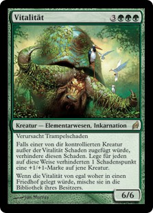 | Rules | Trample If damage would be dealt to another creature you control, prevent that damage. Put a +1/+1 counter on that creature for each 1 damage prevented this way. When Vigor is put into a graveyard from anywhere, shuffle it into its owner's library. |