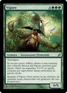 | Rules | Trample If damage would be dealt to another creature you control, prevent that damage. Put a +1/+1 counter on that creature for each 1 damage prevented this way. When Vigor is put into a graveyard from anywhere, shuffle it into its owner's library. |
