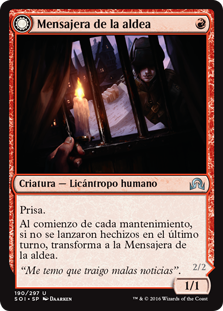 | Rules | Haste At the beginning of each upkeep, if no spells were cast last turn, transform Village Messenger. // Menace (This creature can't be blocked except by two or more creatures.) At the beginning of each upkeep, if a player cast two or more spells last turn, transform Moonrise Intruder. |