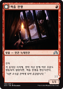 | Rules | Haste At the beginning of each upkeep, if no spells were cast last turn, transform Village Messenger. // Menace (This creature can't be blocked except by two or more creatures.) At the beginning of each upkeep, if a player cast two or more spells last turn, transform Moonrise Intruder. |