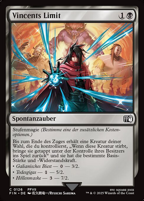 | Rules | Tiered (Choose one additional cost.) Until end of turn, target creature you control gains "When this creature dies, return it to the battlefield tapped under its owner's control" and has the chosen base power and toughness. • Galian Beast — — 3/2. • Death Gigas — — 5/2. • Hellmasker — — 7/2. |