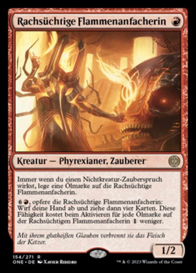 | Rules | Whenever you cast a noncreature spell, put an oil counter on Vindictive Flamestoker. , Sacrifice Vindictive Flamestoker: Discard your hand, then draw four cards. This ability costs less to activate for each oil counter on Vindictive Flamestoker. |