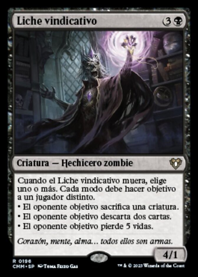 | Rules | When Vindictive Lich dies, choose one or more. Each mode must target a different player. • Target opponent sacrifices a creature. • Target opponent discards two cards. • Target opponent loses 5 life. |