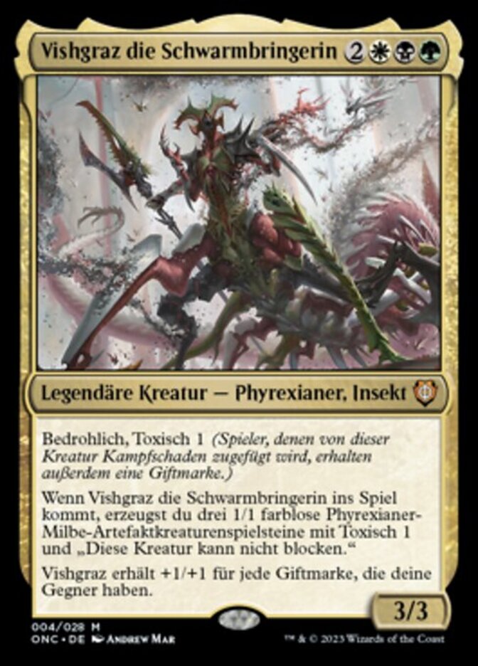 | Rules | Menace, toxic 1 (Players dealt combat damage by this creature also get a poison counter.) When Vishgraz, the Doomhive enters the battlefield, create three 1/1 colorless Phyrexian Mite artifact creature tokens with toxic 1 and "This creature can't block." Vishgraz gets +1/+1 for each poison counter your opponents have. |
