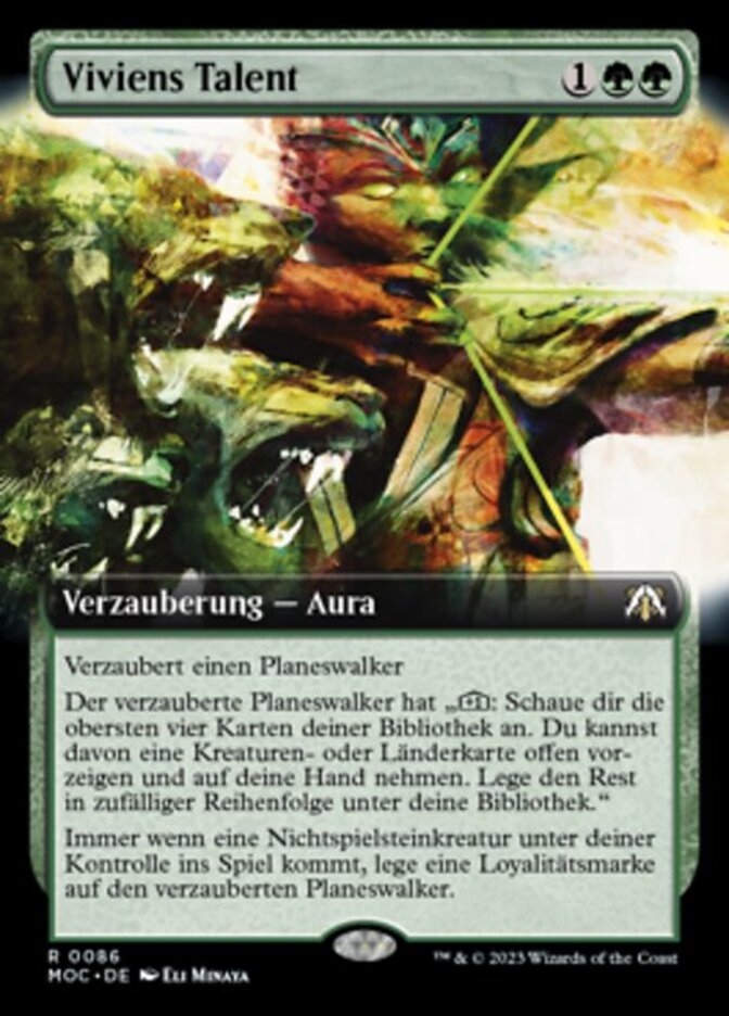 | Rules | Enchant planeswalker Enchanted planeswalker has "[+1]: Look at the top four cards of your library. You may reveal a creature or land card from among them and put it into your hand. Put the rest on the bottom of your library in a random order." Whenever a nontoken creature enters the battlefield under your control, put a loyalty counter on enchanted planeswalker. |