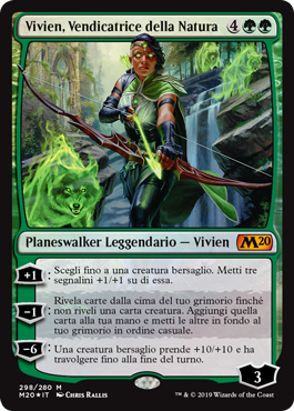 | Rules | +1: Put three +1/+1 counters on up to one target creature. −1: Reveal cards from the top of your library until you reveal a creature card. Put that card into your hand and the rest on the bottom of your library in a random order. −6: Target creature gets +10/+10 and gains trample until end of turn. |