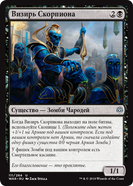 | Rules | When Vizier of the Scorpion enters the battlefield, amass 1. (Put a +1/+1 counter on an Army you control. If you don't control one, create a 0/0 black Zombie Army creature token first.) Zombie tokens you control have deathtouch. |