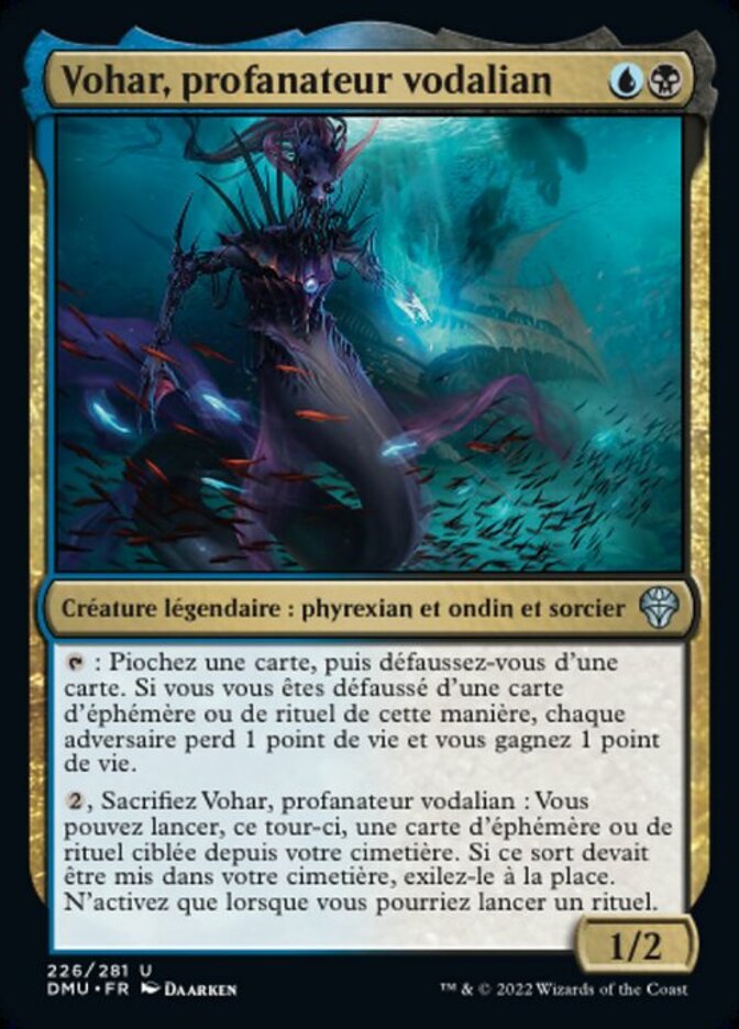 | Rules | : Draw a card, then discard a card. If you discarded an instant or sorcery card this way, each opponent loses 1 life and you gain 1 life. , Sacrifice Vohar, Vodalian Desecrator: You may cast target instant or sorcery card from your graveyard this turn. If that spell would be put into your graveyard, exile it instead. Activate only as a sorcery. |