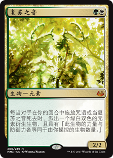 | Rules | Whenever an opponent casts a spell during your turn or when Voice of Resurgence dies, create a green and white Elemental creature token with "This creature's power and toughness are each equal to the number of creatures you control." |