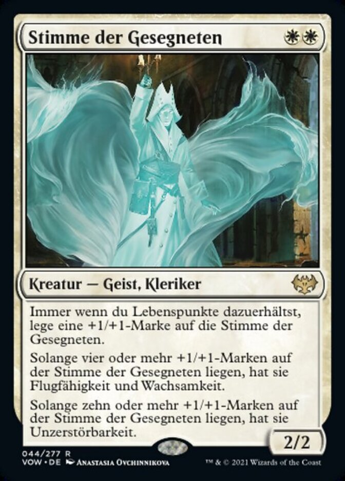 | Rules | Whenever you gain life, put a +1/+1 counter on Voice of the Blessed. As long as Voice of the Blessed has four or more +1/+1 counters on it, it has flying and vigilance. As long as Voice of the Blessed has ten or more +1/+1 counters on it, it has indestructible. |