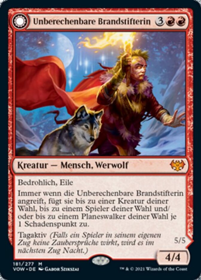 | Rules | Menace, haste Whenever Volatile Arsonist attacks, it deals 1 damage to each of up to one target creature, up to one target player, and/or up to one target planeswalker. Daybound (If a player casts no spells during their own turn, it becomes night next turn.) // Menace, haste Whenever Dire-Strain Anarchist attacks, it deals 2 damage to each of up to one target creature, up to one target player, and/or up to one target planeswalker. Nightbound (If a player casts at least two spells during their own turn, it becomes day next turn.) |