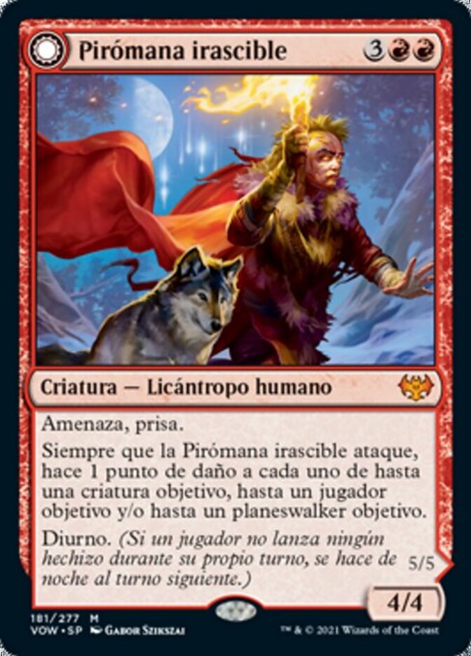 | Rules | Menace, haste Whenever Volatile Arsonist attacks, it deals 1 damage to each of up to one target creature, up to one target player, and/or up to one target planeswalker. Daybound (If a player casts no spells during their own turn, it becomes night next turn.) // Menace, haste Whenever Dire-Strain Anarchist attacks, it deals 2 damage to each of up to one target creature, up to one target player, and/or up to one target planeswalker. Nightbound (If a player casts at least two spells during their own turn, it becomes day next turn.) |