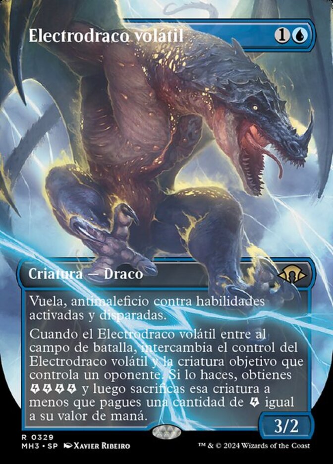 | Rules | Flying, hexproof from activated and triggered abilities When Volatile Stormdrake enters the battlefield, exchange control of Volatile Stormdrake and target creature an opponent controls. If you do, you get , then sacrifice that creature unless you pay an amount of equal to its mana value. |