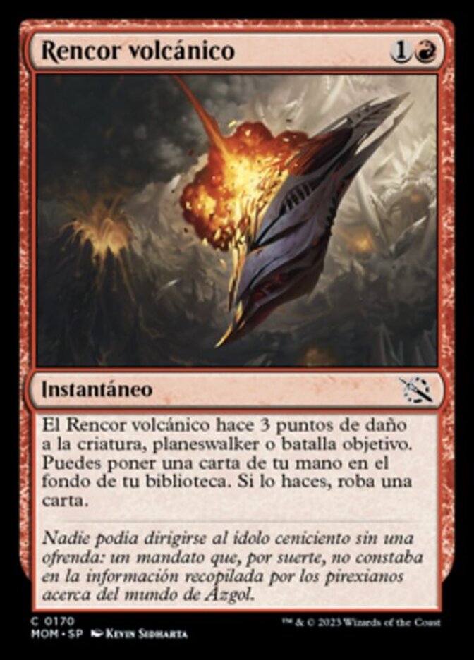 | Rules | Volcanic Spite deals 3 damage to target creature, planeswalker, or battle. You may put a card from your hand on the bottom of your library. If you do, draw a card. |