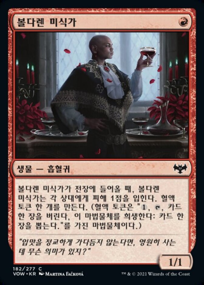 | Rules | When Voldaren Epicure enters the battlefield, it deals 1 damage to each opponent. Create a Blood token. (It's an artifact with ", , Discard a card, Sacrifice this artifact: Draw a card.") |