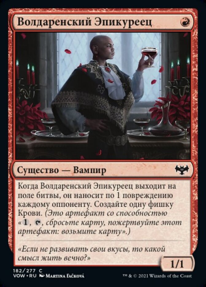 | Rules | When Voldaren Epicure enters the battlefield, it deals 1 damage to each opponent. Create a Blood token. (It's an artifact with ", , Discard a card, Sacrifice this artifact: Draw a card.") |