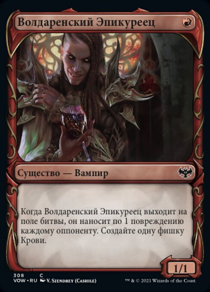 | Rules | When Voldaren Epicure enters the battlefield, it deals 1 damage to each opponent. Create a Blood token. (It's an artifact with ", , Discard a card, Sacrifice this artifact: Draw a card.") |
