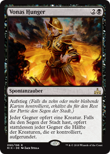 | Rules | Ascend (If you control ten or more permanents, you get the city's blessing for the rest of the game.) Each opponent sacrifices a creature. If you have the city's blessing, instead each opponent sacrifices half the creatures they control, rounded up. |