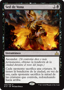 | Rules | Ascend (If you control ten or more permanents, you get the city's blessing for the rest of the game.) Each opponent sacrifices a creature. If you have the city's blessing, instead each opponent sacrifices half the creatures they control, rounded up. |