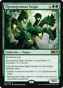 | Rules | Trample Voracious Hydra enters the battlefield with X +1/+1 counters on it. When Voracious Hydra enters the battlefield, choose one — • Double the number of +1/+1 counters on Voracious Hydra. • Voracious Hydra fights target creature you don't control. |