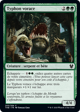 | Rules | Escape—, Exile four other cards from your graveyard. (You may cast this card from your graveyard for its escape cost.) Voracious Typhon escapes with three +1/+1 counters on it. |
