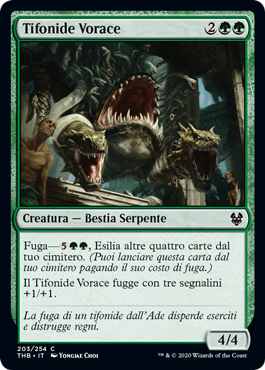 | Rules | Escape—, Exile four other cards from your graveyard. (You may cast this card from your graveyard for its escape cost.) Voracious Typhon escapes with three +1/+1 counters on it. |