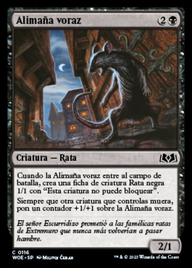 | Rules | When Voracious Vermin enters the battlefield, create a 1/1 black Rat creature token with "This creature can't block." Whenever another creature you control dies, put a +1/+1 counter on Voracious Vermin. |