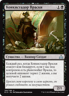 | Rules | Whenever Vraska's Conquistador attacks or blocks, if you control a Vraska planeswalker, target opponent loses 2 life and you gain 2 life. |