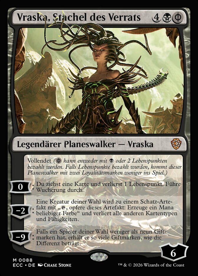| Rules | Compleated ( can be paid with or 2 life. If life was paid, this planeswalker enters with two fewer loyalty counters.) 0: You draw a card and you lose 1 life. Proliferate. −2: Target creature becomes a Treasure artifact with ", Sacrifice this artifact: Add one mana of any color" and loses all other card types and abilities. −9: If target player has fewer than nine poison counters, they get a number of poison counters equal to the difference. |