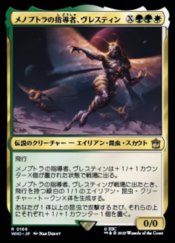 | Rules | Flying Vrestin enters the battlefield with X +1/+1 counters on it. When Vrestin enters the battlefield, create X 1/1 green and white Alien Insect creature tokens with flying. Whenever you attack with one or more Insects, put a +1/+1 counter on each of them. |