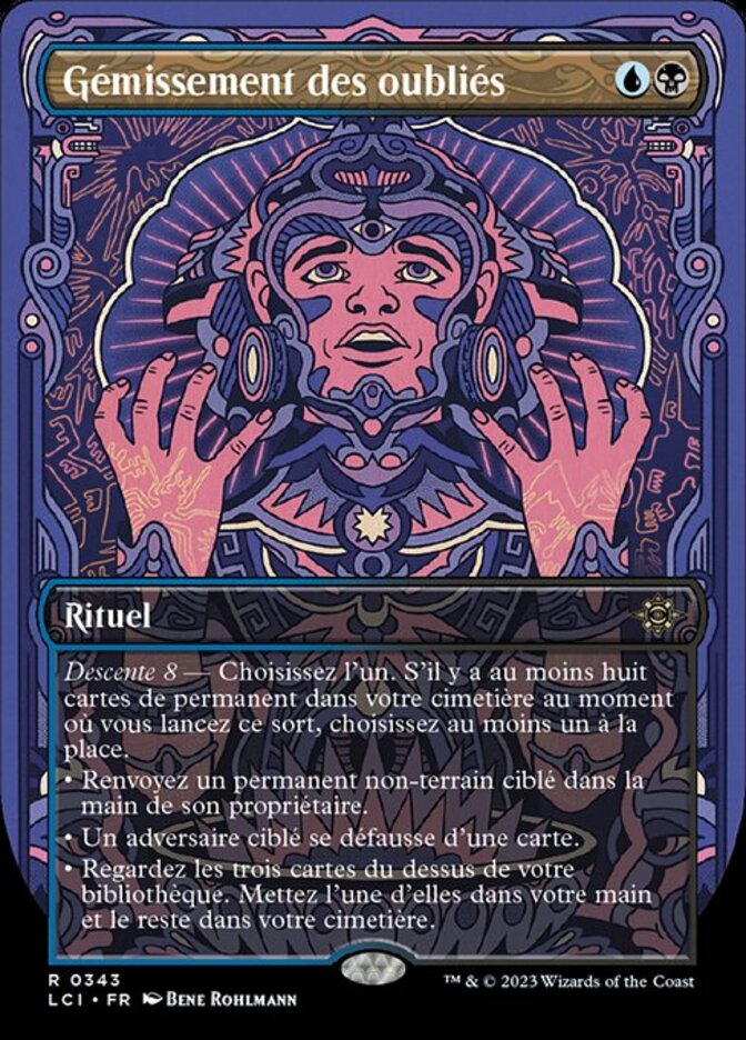 | Rules | Descend 8 — Choose one. If there are eight or more permanent cards in your graveyard as you cast this spell, choose one or more instead. • Return target nonland permanent to its owner's hand. • Target opponent discards a card. • Look at the top three cards of your library. Put one of them into your hand and the rest into your graveyard. |