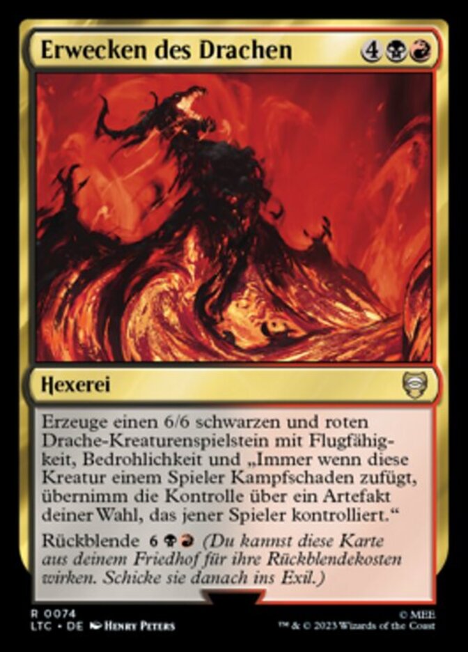 | Rules | Create a 6/6 black and red Dragon creature token with flying, menace, and "Whenever this creature deals combat damage to a player, gain control of target artifact that player controls." Flashback (You may cast this card from your graveyard for its flashback cost. Then exile it.) |