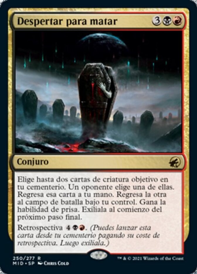 | Rules | Choose up to two target creature cards in your graveyard. An opponent chooses one of them. Return that card to your hand. Return the other to the battlefield under your control. It gains haste. Exile it at the beginning of the next end step. Flashback (You may cast this card from your graveyard for its flashback cost. Then exile it.) |