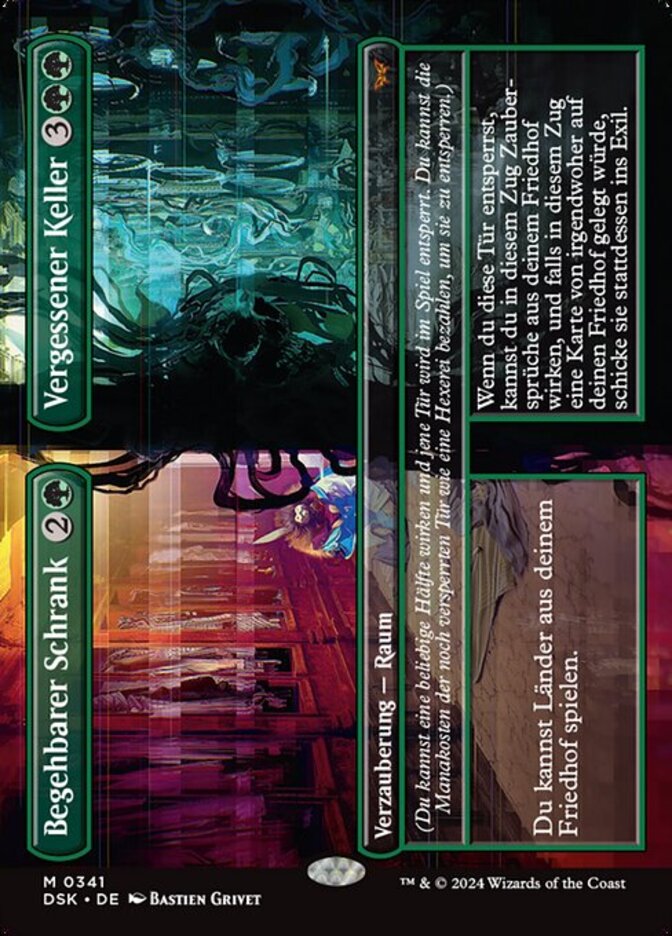 | Rules | (You may cast either half. That door unlocks on the battlefield. As a sorcery, you may pay the mana cost of a locked door to unlock it.) You may play lands from your graveyard. // (You may cast either half. That door unlocks on the battlefield. As a sorcery, you may pay the mana cost of a locked door to unlock it.) When you unlock this door, you may cast spells from your graveyard this turn, and if a card would be put into your graveyard from anywhere this turn, exile it instead. |