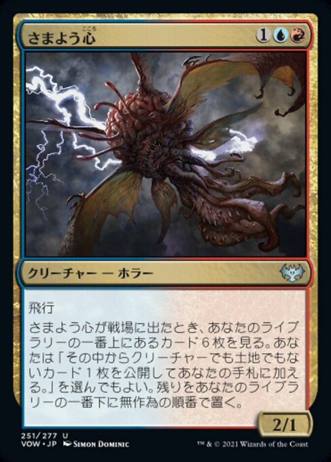 | Rules | Flying When Wandering Mind enters the battlefield, look at the top six cards of your library. You may reveal a noncreature, nonland card from among them and put it into your hand. Put the rest on the bottom of your library in a random order. |