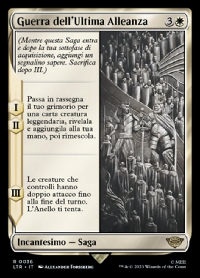 | Rules | (As this Saga enters and after your draw step, add a lore counter. Sacrifice after III.) I, II — Search your library for a legendary creature card, reveal it, put it into your hand, then shuffle. III — Creatures you control gain double strike until end of turn. The Ring tempts you. |