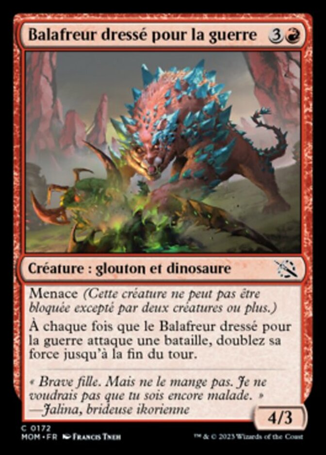 | Rules | Menace (This creature can't be blocked except by two or more creatures.) Whenever War-Trained Slasher attacks a battle, double its power until end of turn. |